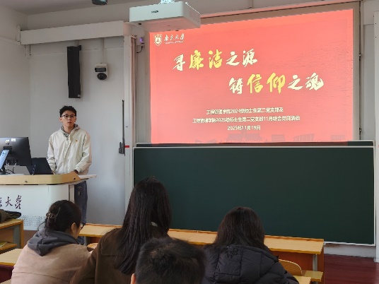 為深入學(xué)習(xí)貫徹黨的二十屆四中全會(huì)關(guān)于“以黨的自我革命引領(lǐng)社會(huì)革命,持之以恒推進(jìn)全面從嚴(yán)治黨”的重要部署,2025年11月19日下午,南京大學(xué)工程管理學(xué)院2024級(jí)碩士生第二黨支部與2025級(jí)碩士生第二黨支部聯(lián)合開(kāi)展“尋廉潔之源,鑄信仰之魂”王荷波精神學(xué)習(xí)暨黨的二十屆四中全會(huì)精神學(xué)習(xí)主題黨日活動(dòng)。本次活動(dòng)共分為兩個(gè)部分,兩個(gè)支部全體黨員及積極分子共同參與。