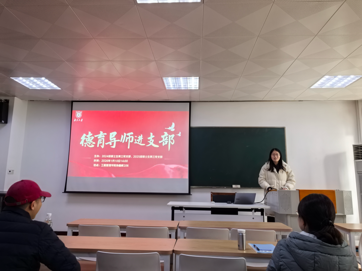 冬日暖陽沐初心,砥礪奮進(jìn)正當(dāng)時(shí)。2026年1月10日下午,工程管理學(xué)院2024級(jí)碩士生第三黨支部與2025級(jí)碩士生第三黨支部在協(xié)鑫樓206聯(lián)合開展“德育導(dǎo)師進(jìn)支部”主題黨日活動(dòng)。聯(lián)系支部的學(xué)院黨委委員徐薇老師出席活動(dòng),研究生德育導(dǎo)師羅志興老師受邀作專題分享,2025級(jí)碩士生第三黨支部宣傳委員兼紀(jì)檢委員孫劉偉主講主題黨課。活動(dòng)由2024級(jí)碩士生第三黨支部書記吳曉云主持,兩個(gè)支部全體黨員、積極分子和入黨申請(qǐng)人共同參與,在思想碰撞與精神傳承中凝聚奮進(jìn)力量。