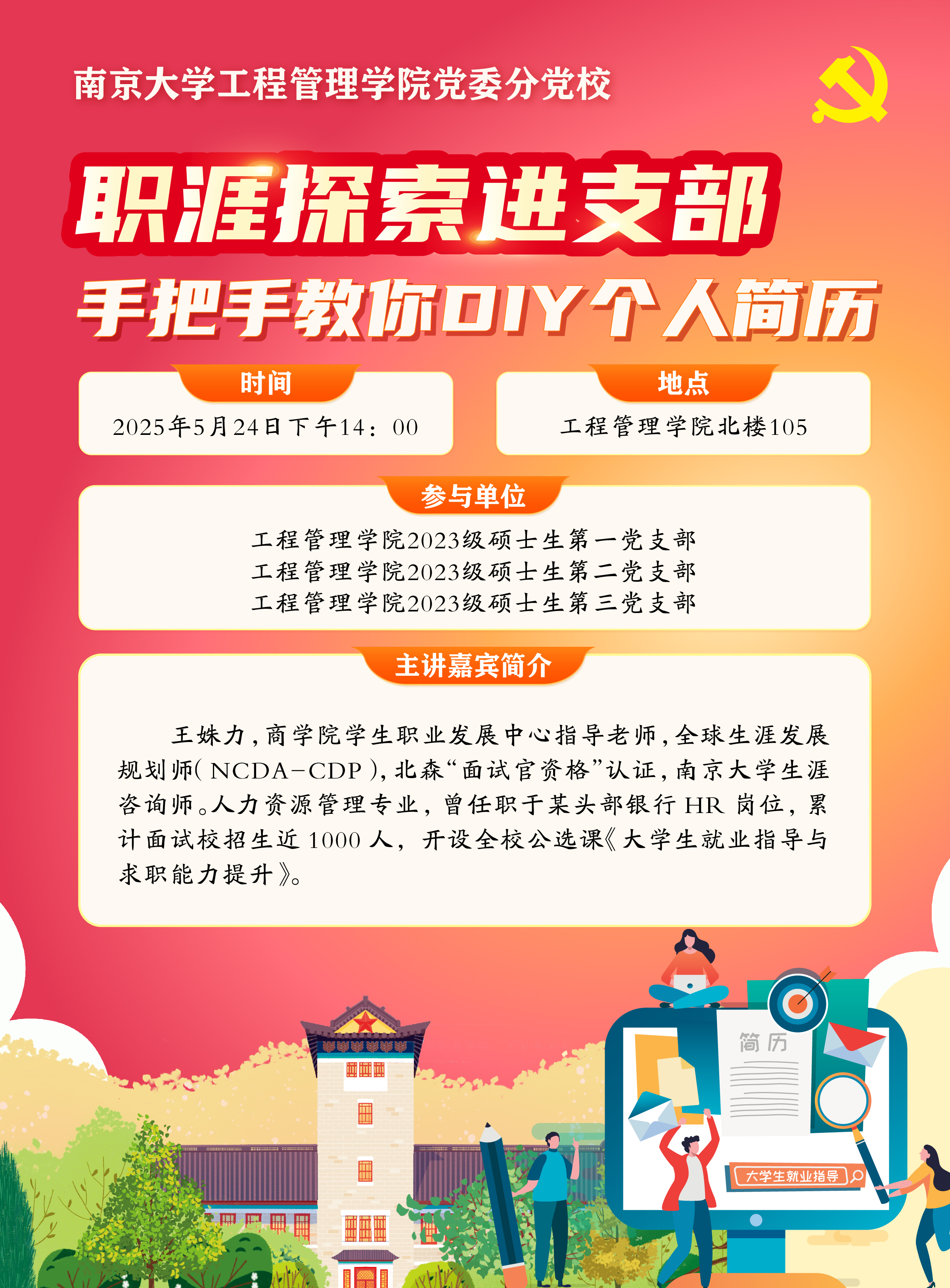 此次活動邀請到了南京大學就業(yè)育人講師團、商學院學生職業(yè)發(fā)展中心指導(dǎo)老師王姝力擔任主講人。工程管理學院黨委組織員老師在開場詳細介紹了王姝力老師豐富的專業(yè)背景:王姝力老師是全球生涯發(fā)展規(guī)劃師、北森“面試官資格”認證獲得者、南京大學生涯咨詢師,還擁有人力資源管理專業(yè)背景,曾任職于某頭部銀行HR崗位,累計面試校招生近1000人,并開設(shè)全校公選課《大學生就業(yè)指導(dǎo)與求職能力提升》,有著豐富的指導(dǎo)實踐。