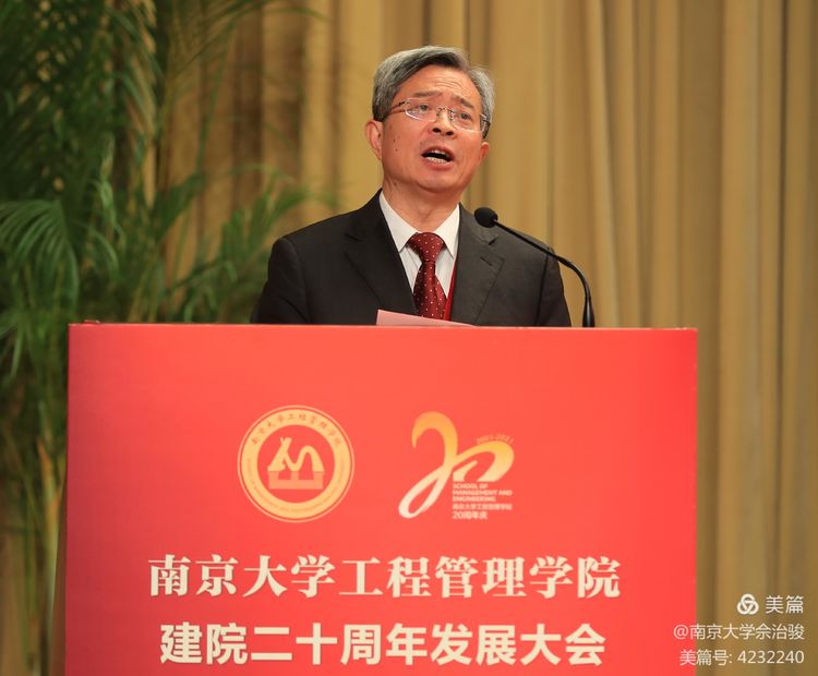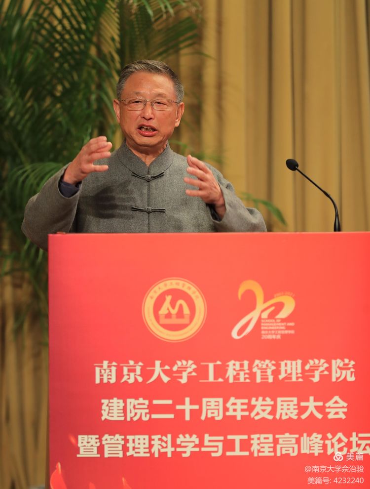 楊忠在致辭中高度肯定了工程管理學院的辦學發(fā)展。他表示,在近120年的辦學歷程中,南京大學及其前身始終與時代同呼吸,與民族共命運,為國家的富強、民族的振興、科技的進步、文化的繁榮做出了貢獻。工程管理學院是在南京大學文理工醫(yī)協(xié)調發(fā)展的戰(zhàn)略背景下成立的一所朝氣蓬勃、欣欣向榮的年輕學院。20年前,以盛昭瀚教授為首的5人團隊來到南大,創(chuàng)辦了管理科學與工程研究院,以團結拼搏、協(xié)同作戰(zhàn)的精神,組建了文、理、工、管交叉融合的跨學科研究和教學團隊,構建起了從本科、碩士到博士的完整人才培養(yǎng)體系,開啟了櫛風沐雨、篳路藍縷、砥礪前行的光榮歷程。20年來,工程管理學院在強化原創(chuàng)性高水平理論研究的基礎上,立足學科特色,布局“兩橫四縱”的發(fā)展模式、瞄準國家重大戰(zhàn)略需求、服務國家重大工程,實現(xiàn)了從無到有,從弱到強的跨越式發(fā)展,人才培養(yǎng)碩果累累,科研創(chuàng)新持續(xù)發(fā)力,在國內外同行中取得較大影響。