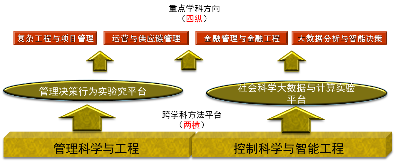 學(xué)院以“特色、交叉、高水平、國(guó)際化”為學(xué)科建設(shè)的宗旨,并結(jié)合學(xué)院自身特點(diǎn),堅(jiān)持“管理-控制一體化”的交叉融合發(fā)展理念,以理論研究瞄準(zhǔn)國(guó)際學(xué)術(shù)前沿、應(yīng)用研究瞄準(zhǔn)國(guó)家重大需求為學(xué)科發(fā)展目標(biāo),以管理科學(xué)與工程和控制科學(xué)與智能工程兩大學(xué)科為基礎(chǔ),以已有雄厚科研基礎(chǔ)的“智能決策行為實(shí)驗(yàn)平臺(tái)”和“社會(huì)科學(xué)大數(shù)據(jù)與計(jì)算實(shí)驗(yàn)平臺(tái)”為支撐(兩橫),凝煉形成了具有鮮明特色的四個(gè)研究方向(四縱),科學(xué)規(guī)劃了“兩橫四縱”的學(xué)科布局: